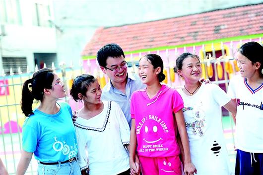 湖北日报讯 近日,襄阳市樊城区太平店镇,湖北文理学院辅导员程威(左三)和同伴教留守儿童唱歌。5年前,程威打工救母背母上学感动社会,并得到各界关爱和帮助。他毕业留校后,将感恩化为行动,学校帮助组建“程威志愿者协会”,对农村留守儿童长期开展教育帮扶,帮助他们健康快乐成长。(记者 田悦 视界网 陈富民 摄)